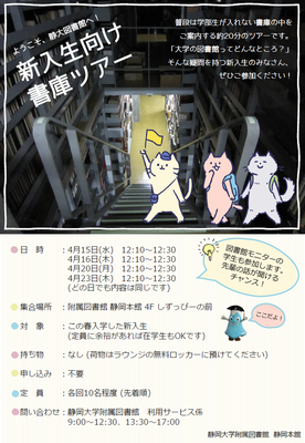 図書館モニターの学生たちも参加するので、先輩から静大図書館のことを聞くことができますよ。